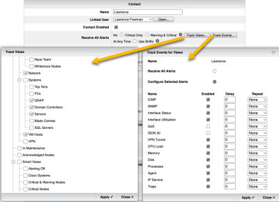 Tracked Views and Track Events provide a more selective method of receiving Alerts from groups of nodes you have arranged into custom views. Click [Track Views] to open the view selection panel.